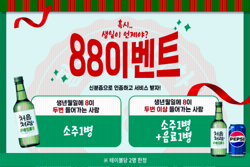 생년월일에 8이 두번 들어가시면 소주1병 세번이상 이면 추가 음료 1개 서비스로드립니다