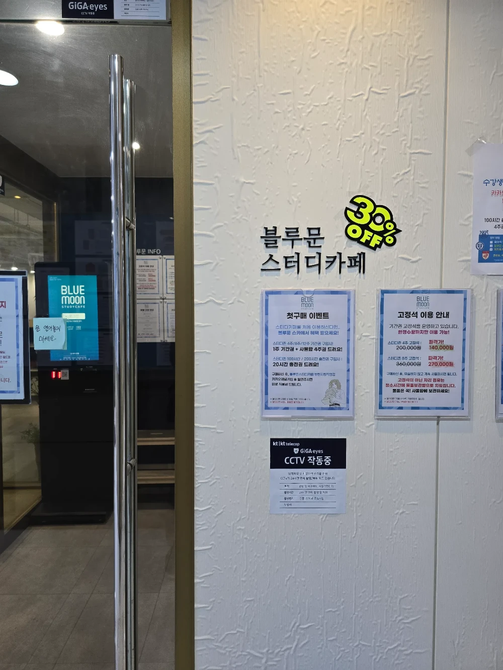 첫구매 이벤트 진행중!! 스터디카페를 처음 이용하시는 분이시라면 블루문스터디카페에서 헤택받으세요 한정수량으로 적용되고 있으니 댓글 달아 주세요~^^ 카카오 채널 친구 이벤트 같이 공부하고 싶은 친구가 있다면... 함께 공부하세요! 소개한 친구와 소개받은 친구에게 충전권도 드려요~~ 블루문스터디카페 고정석 이용안내 스터디카페 자유석이용가로 고정석 이용해 보세요! 스터디카페의 평균가격보다 저렴하게 이용가능한 블루문스터디카페!! 늦게 알면 손해보는 스터디카페! 블루문스터디카페를 이용하시는 분은 한번만 이용하지 않습니다.